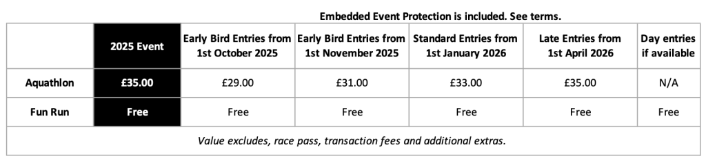 Fun Run – this event is free to enter for friends & family of the event, please collect a number at registration. The start will be by the green flag near the finish line. The fun run is aimed at those who are too young to race the aquathlon.